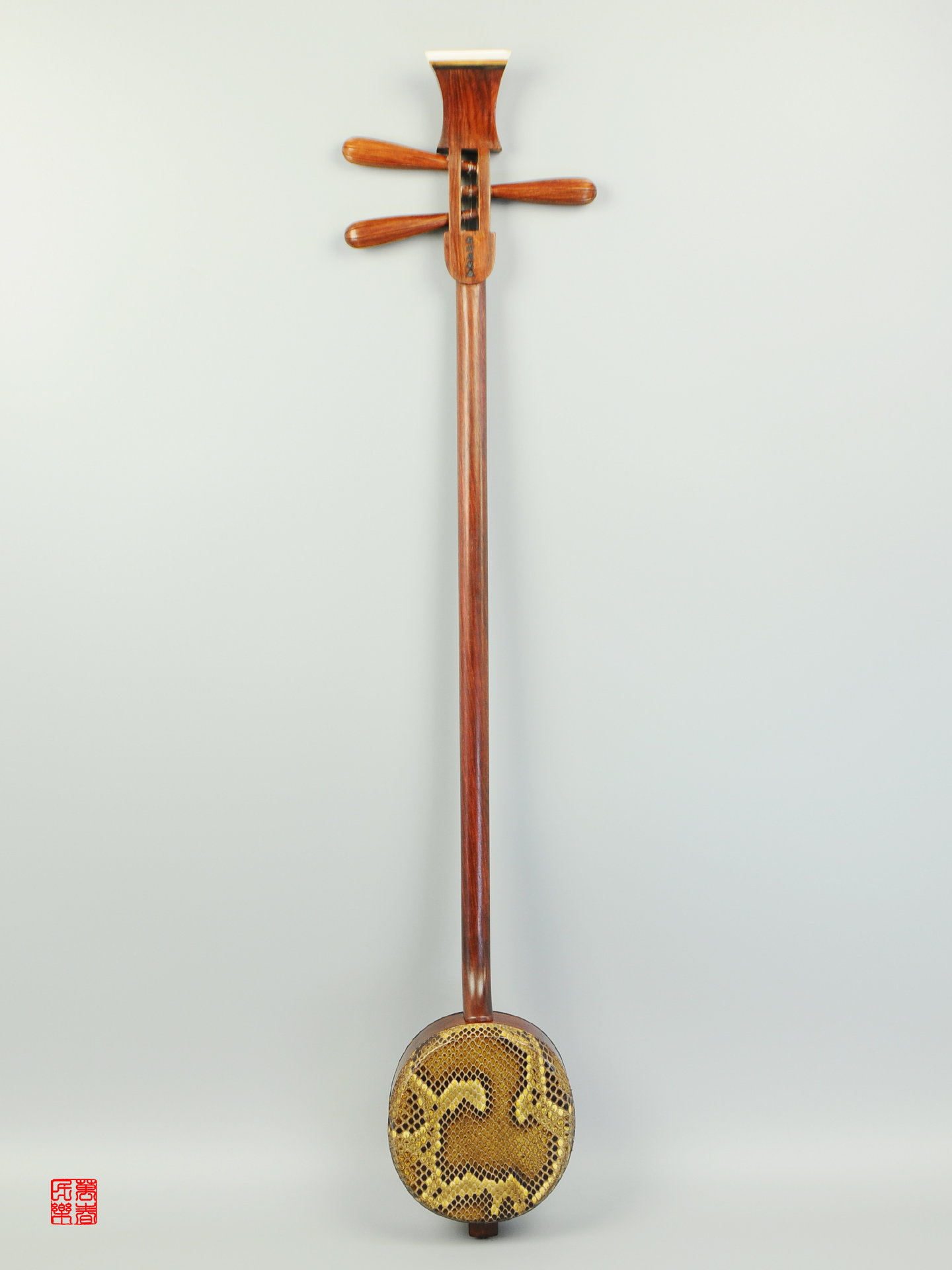 采用高档花梨木老料和缅甸蟒皮为主材制作,手工制堂双面古法鞔皮定音,整琴由周万春第三代传人、苏州市工艺大师、高级工艺师周健先生手工制作。“周万春”以善制三弦而闻名与江南一带,特别是“评弹小三弦,深受广大评弹专业演奏员和爱好者的喜欢,在评弹界享有很高的声誉。著名评弹艺术家徐云志特别为“周万春”编写弹词开篇在每场演出前宣传演唱。"周万春"的三弦及二胡已被多家博物馆及器乐爱好者所收藏。小三弦:小三弦是中国古老的弹拨乐器之一,历史悠久,文化渊源悠长。评弹小三弦又称为“书弦”是苏州评弹的主要伴奏乐器之一。有琴杆、琴枕、琴鼓三大部分组成,小三弦没有固定音高,只要是在好弹、好调、好听、好唱的氛围内,可随意调,三根弦的定弦一般是c1、g1、c2,最基本、最常用的定弦是五四度,为1、5、1和2、6、2。